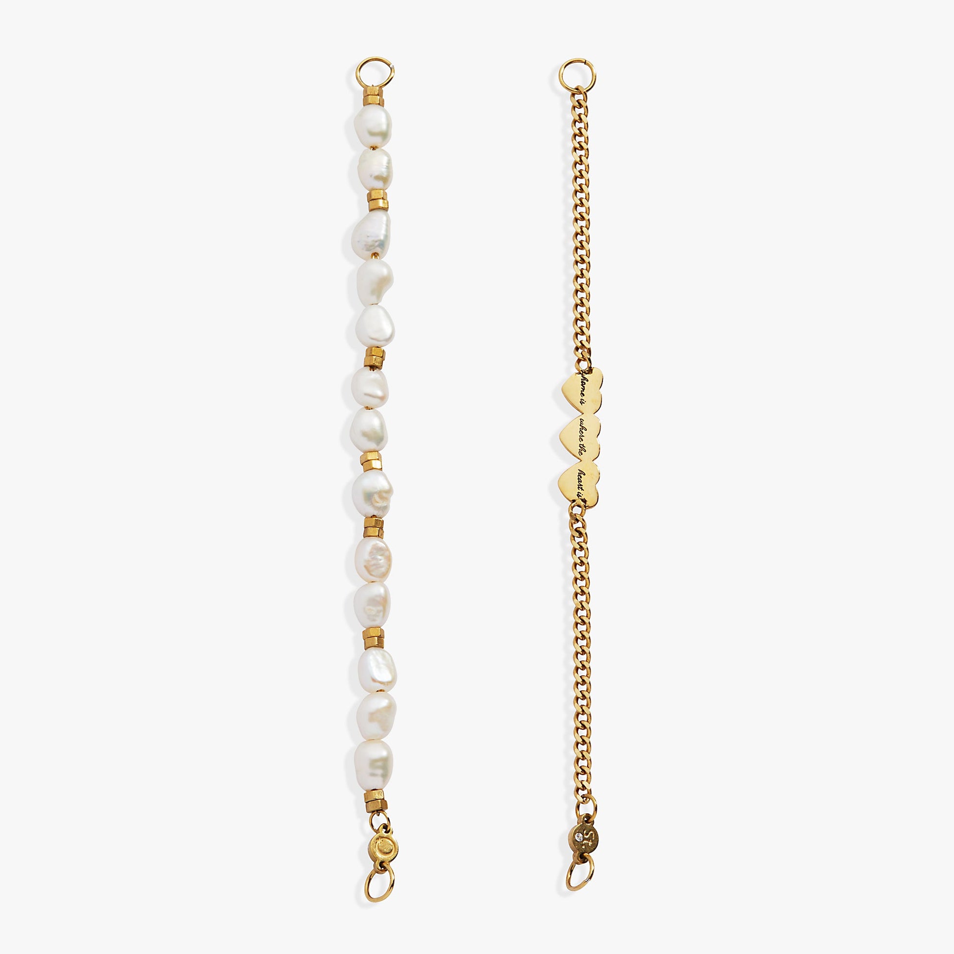 This charming bracelet pairs a pearl strand with a fun, dimensional heart strand, etched on the back with the phrase "Home is where the heart is."