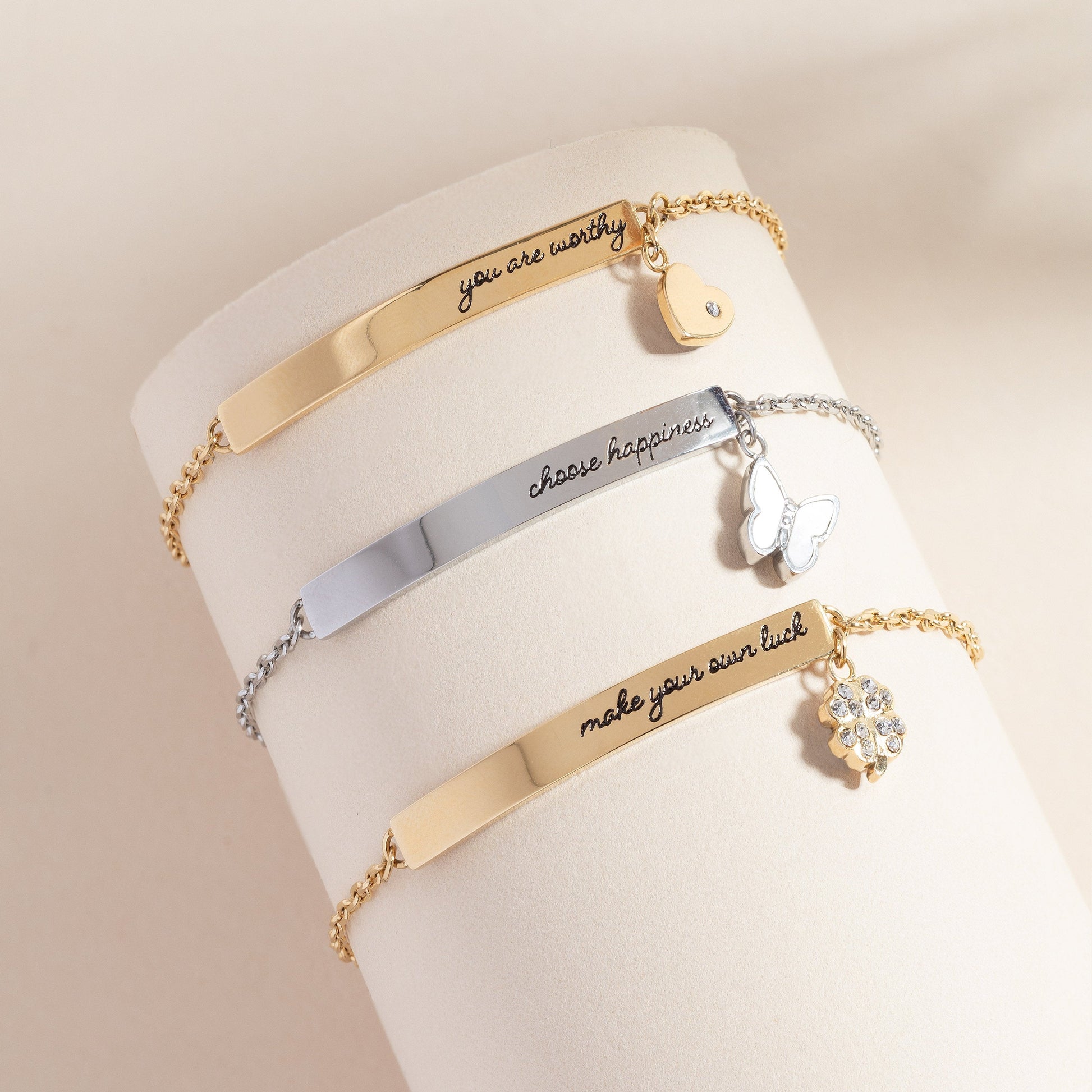 With a little luck, every moment is an opportunity to manifest your dreams. This Engraved Bracelet features an engraved plaque that says “Make Your Own Luck” inline on an adjustable-length chain bracelet, with a crystal four-leaf clover charm. Wear it — or gift it — as a reminder that you’ve got the power to make it all happen. Because it’s gold-tone stainless steel, it’s durable and scratch-resistant so you can wear it on repeat.