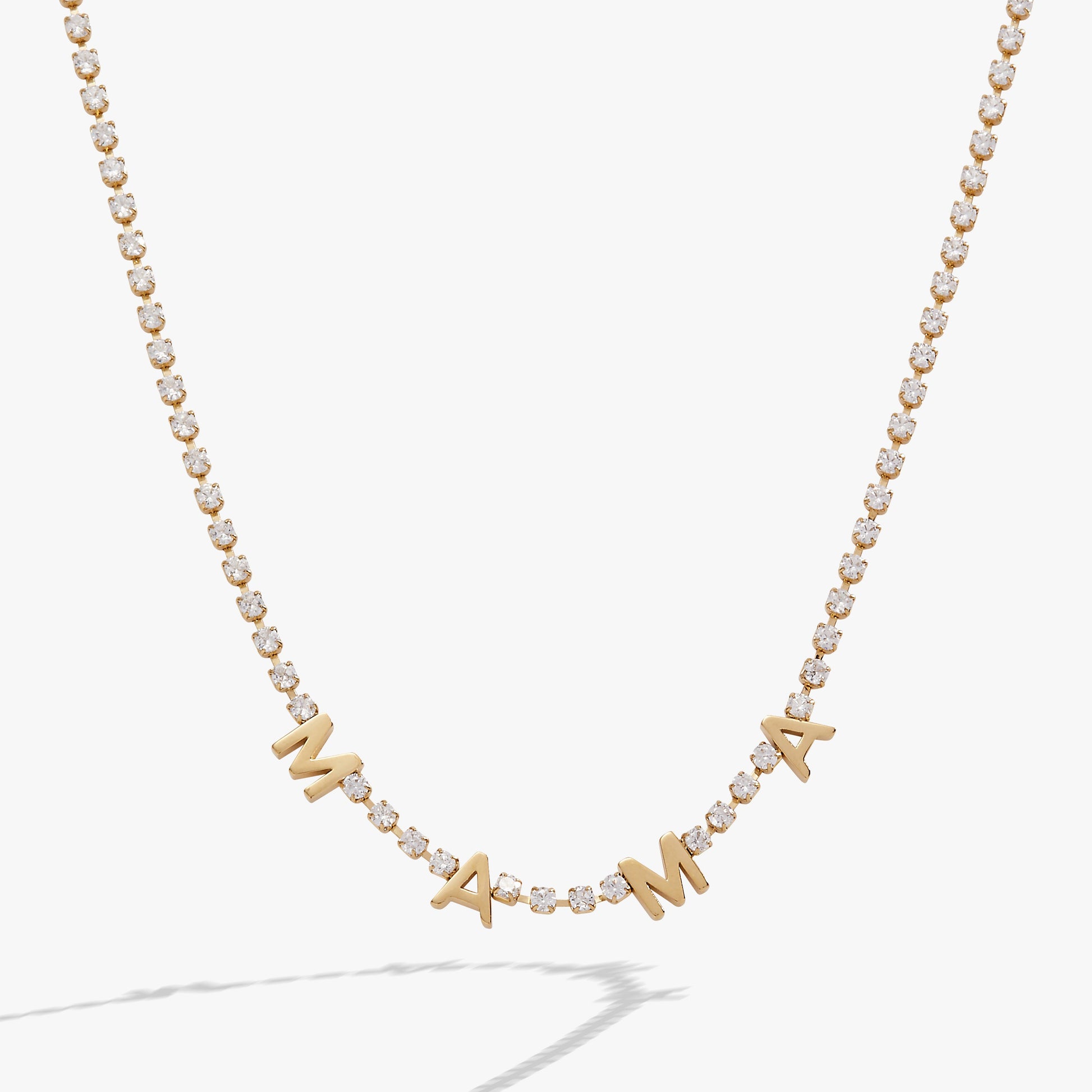 Discover our Mama Crystal Tennis Necklace, a modern twist on a classic. Featuring sleek letters spelling 'MAMA' on a crystal chain, it's perfect for any mom who loves unique style. Wear it alone or layer it with other necklaces to enhance any outfit, casual or formal.