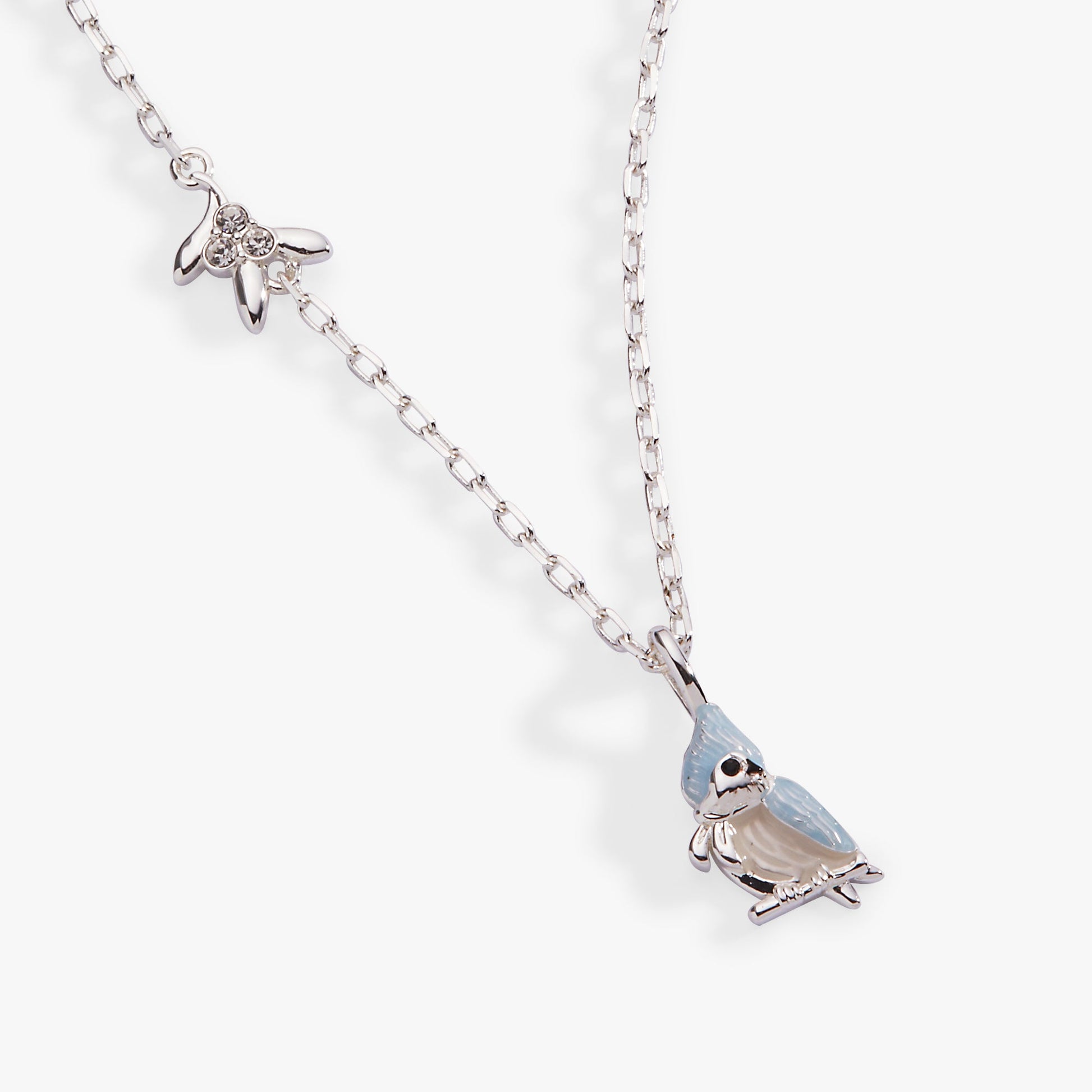 Celebrate the season with this charming silver-plated necklace featuring a three-dimensional tufted titmouse bird adorned with transparent blue-grey enamel, pearlized white detailing, and a tiny decorative scarf. Delicate mistletoe sprigs with sparkling crystal berries accent the chain, creating a whimsical winter scene. Known for its cheerful song and winter presence, the tufted titmouse symbolizes joy, happiness, and good fortune—while mistletoe represents love and togetherness. Perfect for bird lovers and holiday enthusiasts alike, this playful piece captures the magic of the season without feeling too festive to wear year-round.